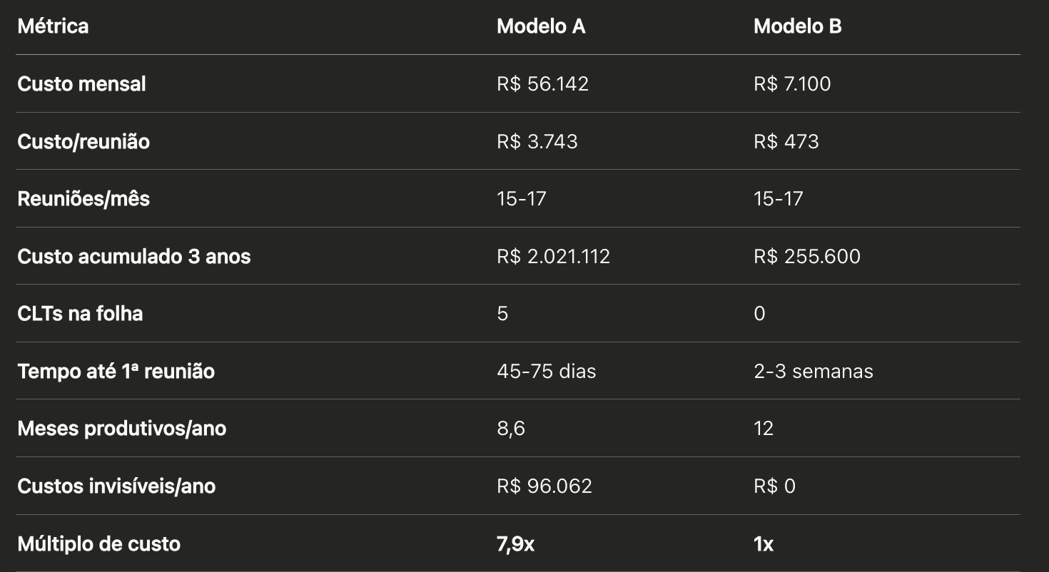 Diferença: 7,9x Economia acumulada 3 anos: R$ 1.765.512 Para mesmo output. Mesmas reuniões. Zero CLTs. E você continua financiando Modelo A. Por quê? Porque nunca calculou custo real por reunião. Só vê salários mensais. Ignora custo invisível. A Anatomia Dos 2 Modelos (Breakdown Completo)MODELO A: TRADICIONAL (O QUE 95% FAZ)Quem opera: 👤👤👤👤 4 SDRs Plenos (CLT) 👤 1 Coordenador Pré-Vendas (CLT) └─ 5 vínculos CLT ativos Como funil funciona: 📢 Abordagens: 3.200/mês ↓ 💼 Conexões aceitas (26%): 416 ↓ 📧 Respostas DM no LinkedIn (13%): 54 ↓ 💬 Com potencial real: 59 ↓ 🔗 Com potencial real (follow-up): 59 ↓ 📅 Reuniões agendadas: 15-17/mês Estrutura de custos: CUSTOS VISÍVEIS: